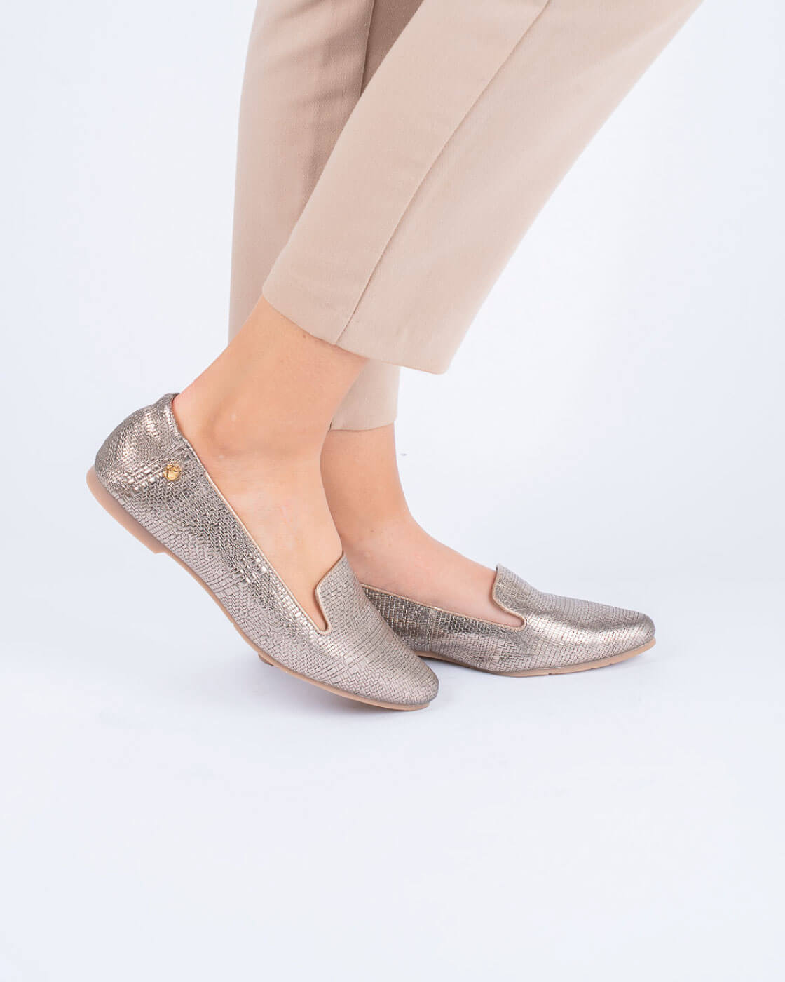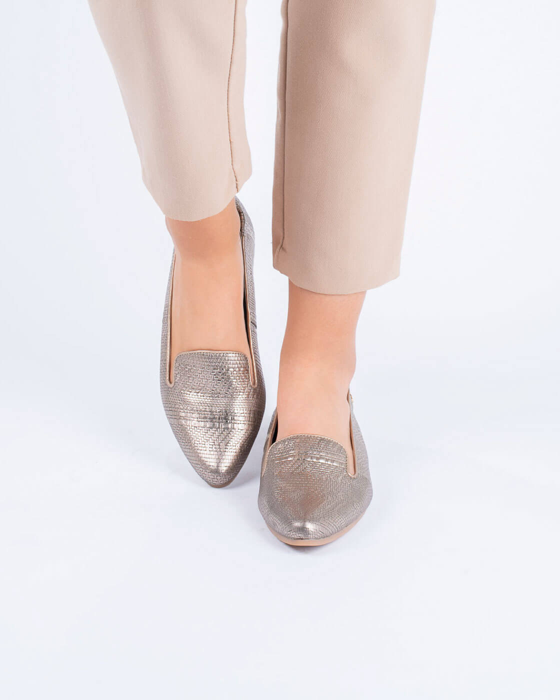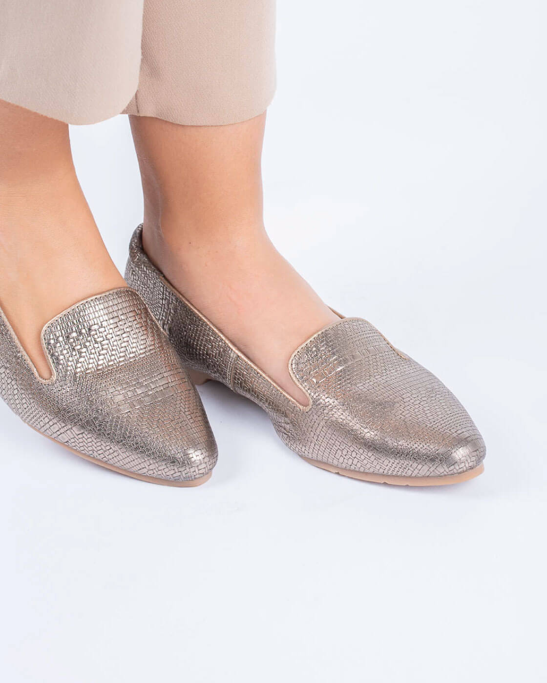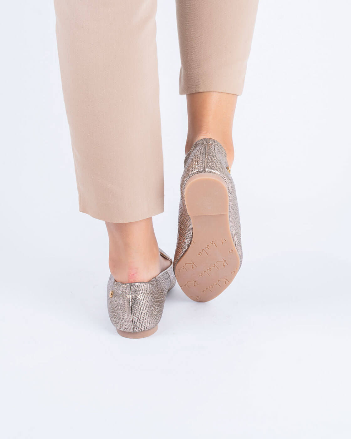 La Baleta Broncea está confeccionada en cuero texturizado color bronce, un tono que aporta calidez y sofisticación a cualquier look. Su diseño en punta estiliza el pie, mientras que el forro en cuero extrasuave ofrece una sensación de comodidad y frescura en cada paso.