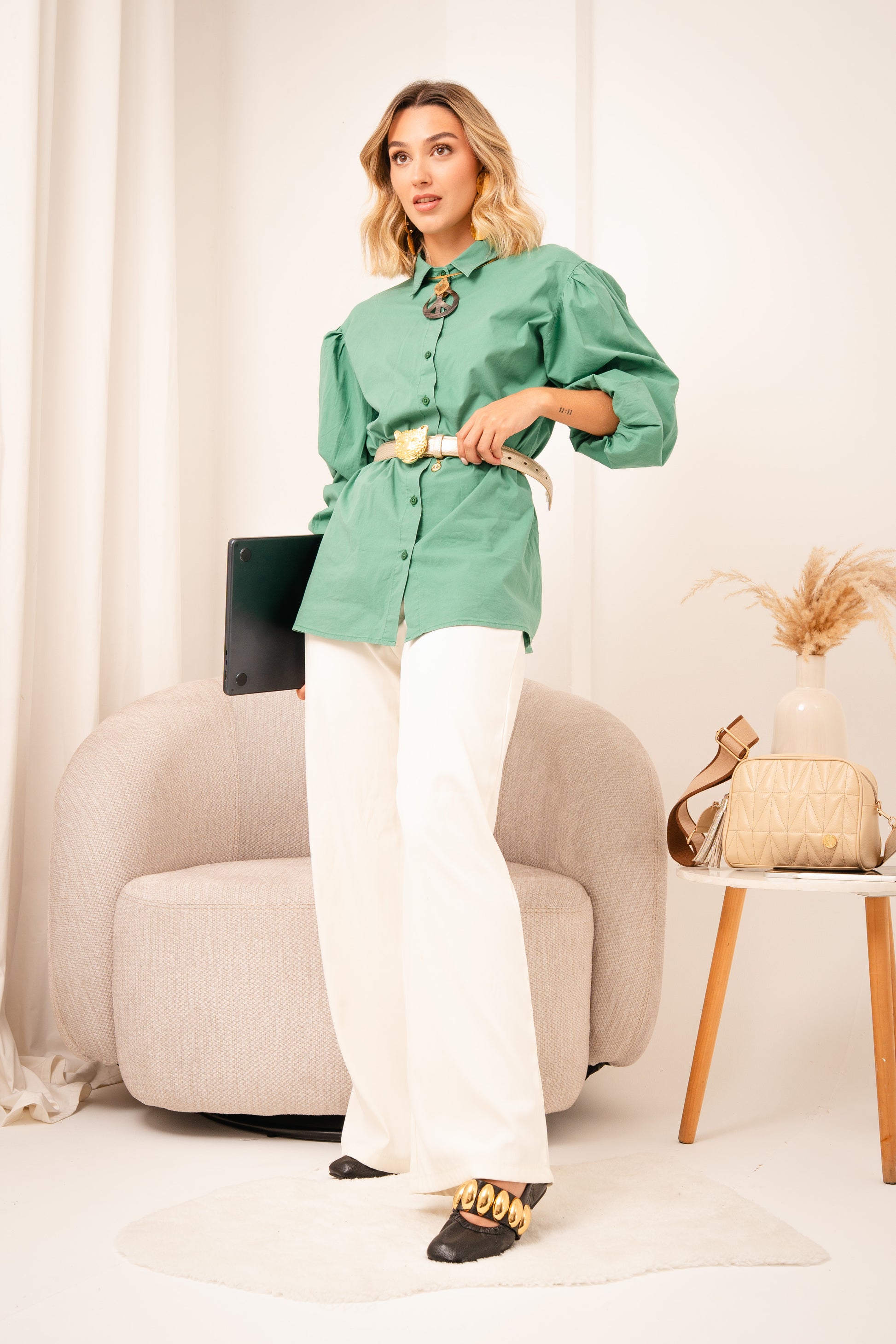 Elaborada 100% en Colombia, esta baleta combina cuero de alta calidad con una silueta cómoda y flexible, ideal para acompañarte en jornadas largas sin perder elegancia. Su diseño de punta suave y ajuste preciso ofrece estabilidad y confort, mientras el herraje dorado aporta un toque de poder sutil que eleva cualquier look de oficina o día a día.