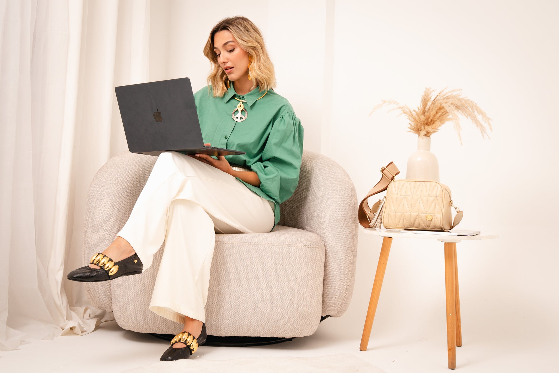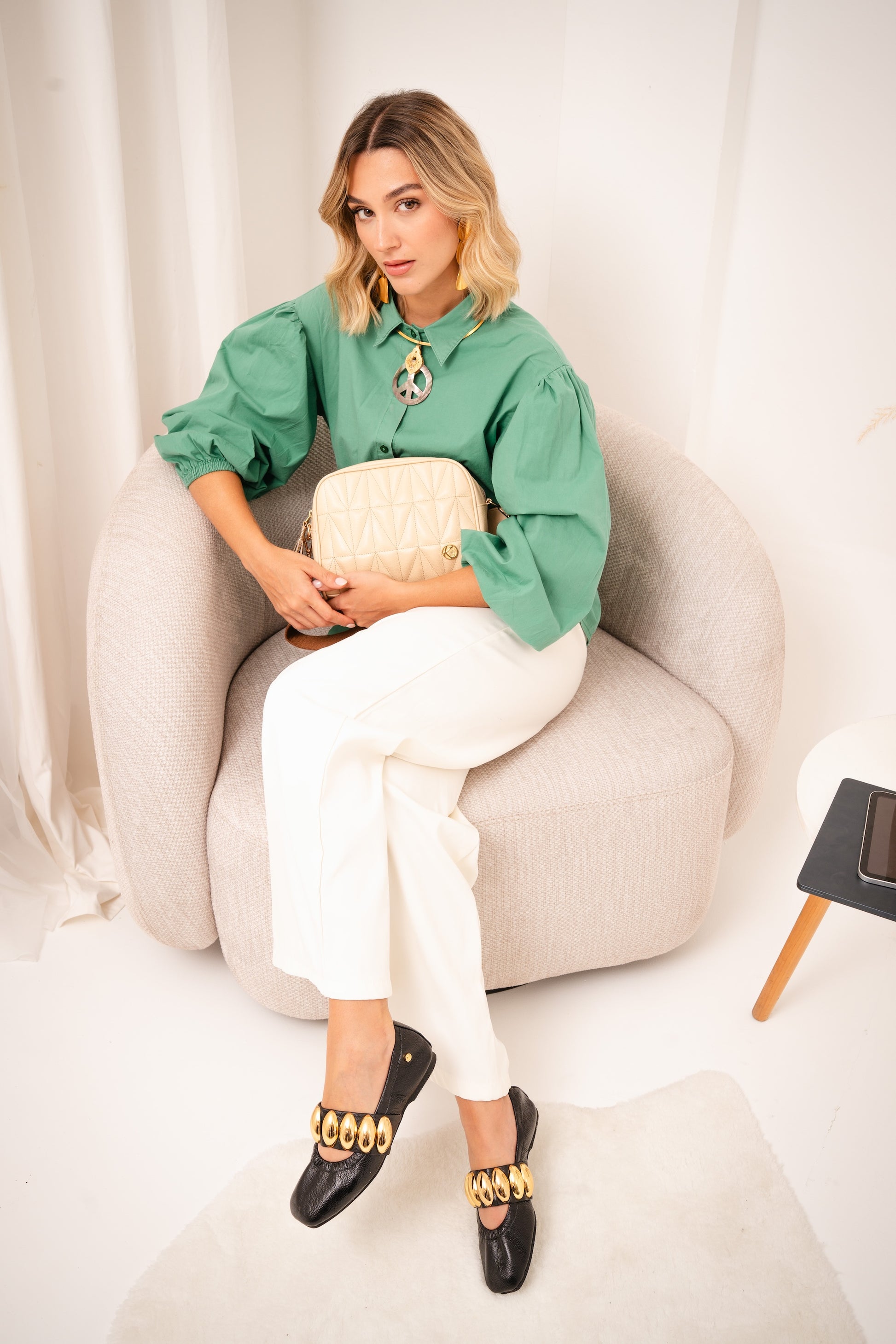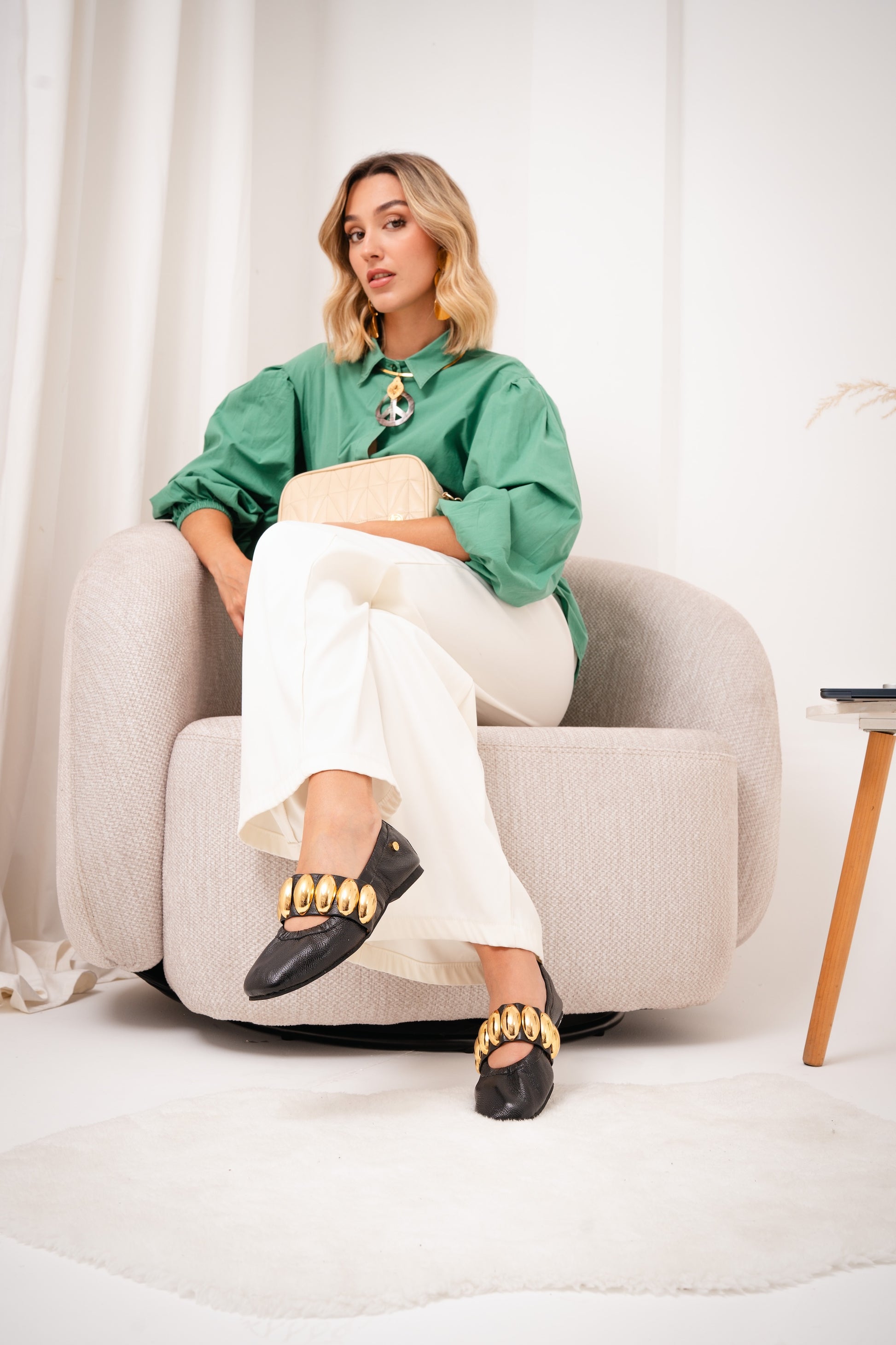 La Baleta Clarice Negro es una pieza que transforma lo esencial en sofisticación. Su diseño limpio en tono neutro se eleva con una cadena dorada protagonista, pensada para mujeres que entienden que el verdadero lujo está en los detalles.