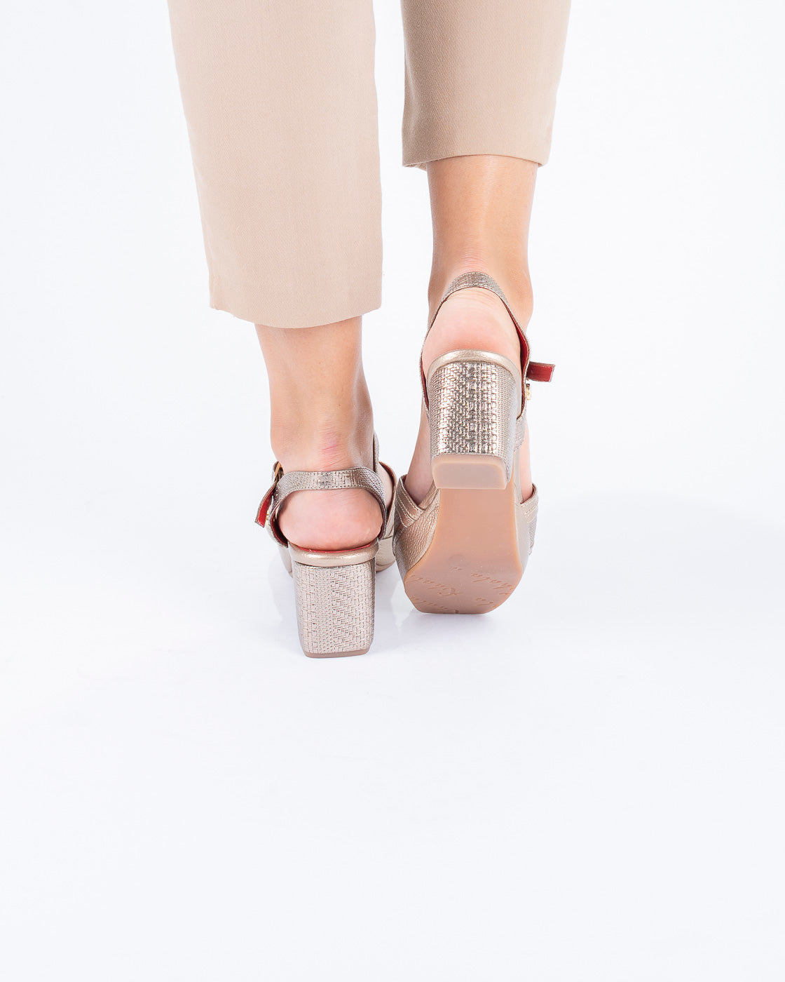 La Sandalia Bronce Aura combina una mezcla armoniosa de texturas en tono bronce con un diseño pensado para dar altura con suavidad. Su tacón de 5 cm junto a una plataforma de 2 cm crea una inclinación mínima que permite caminar con confort absoluto, mientras que el forro rojo aporta un detalle distintivo y lleno de carácter. La trabilla tradicional ofrece un ajuste adaptable al pie, y la suela en goma antideslizante garantiza seguridad en cada paso. Un diseño versátil, elegante y creado para acompañarte durante todo el día.