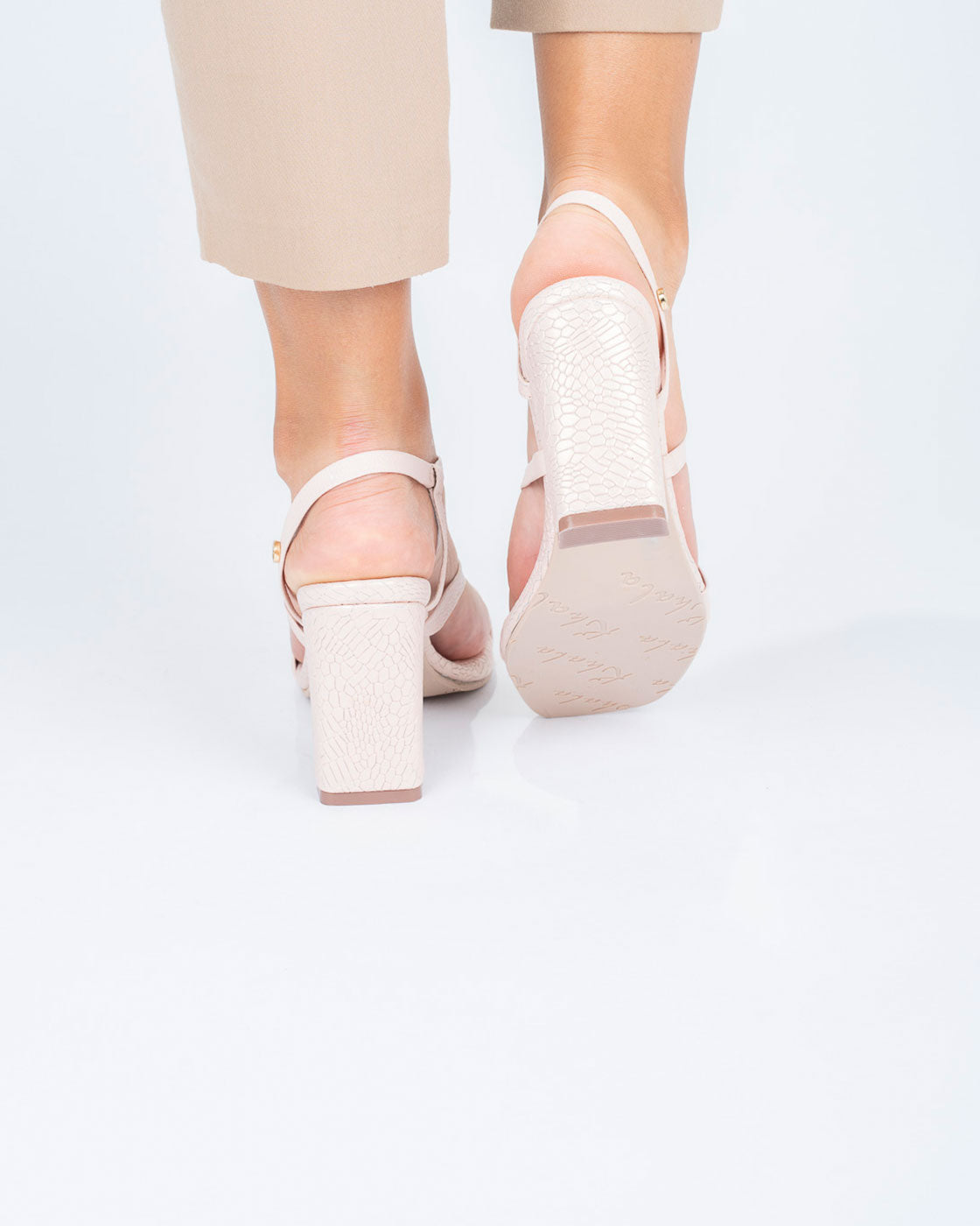 Elegancia serena en tono nude. Diseñada con horma cuadrada y tacón paleta, esta sandalia combina cueros lisos y texturizados que dialogan con sutileza. Sus tiras delgadas, limpias y sin hebillas, envuelven el pie con ligereza, mientras la plantilla acolchonada y la suela de goma a tono aseguran un paso delicado, estable y consciente. Una pieza que acompaña con equilibrio y carácter.